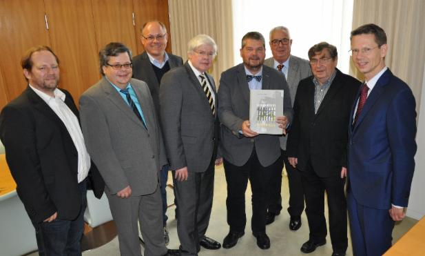Freuen sich gemeinsam über die Neuerscheinung „Schweinfurt und seine Denkmäler (v. r.): OB Sebastian Remelé, Karl-Heinz Weppert (Weppdesign), Klaus Stapf (Geschäftsführer Kulturstiftung), Dr. Erich Schneider (Autor), Dr. Uwe Müller (Historischer Verein), Hans Hatos (Sanierungsstelle), Richard Riegler (Sanierungsstelle), Nicolas Weppert (Weppdesign).